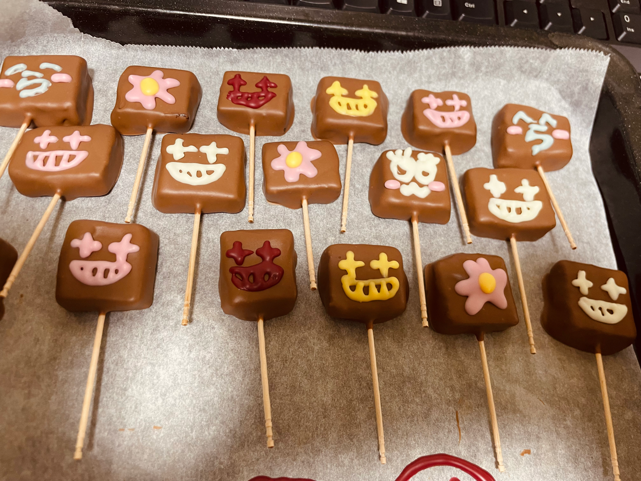 チョコペンでかわいいポリンチョコを作った傍らで、ゴブリンの顔をした地獄みたいな生チョコも作ったんですね。こっちはいつもゴブリン仮面つけてるギルメン筆頭にみんなにあげて、とても笑って貰えました。はぴ🫶🏻