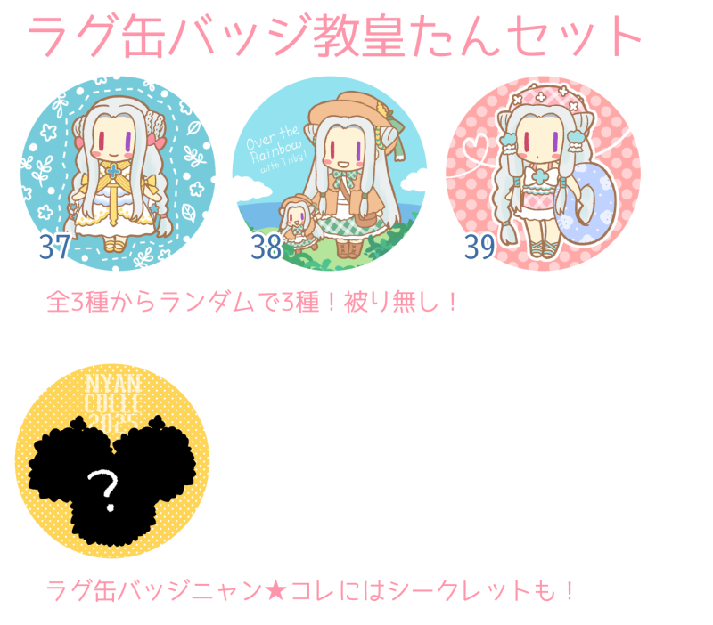 ニャン★コレは全36種+シークレット、教皇たんは全3種からランダムで3つをお届けします。つまり全部だ。