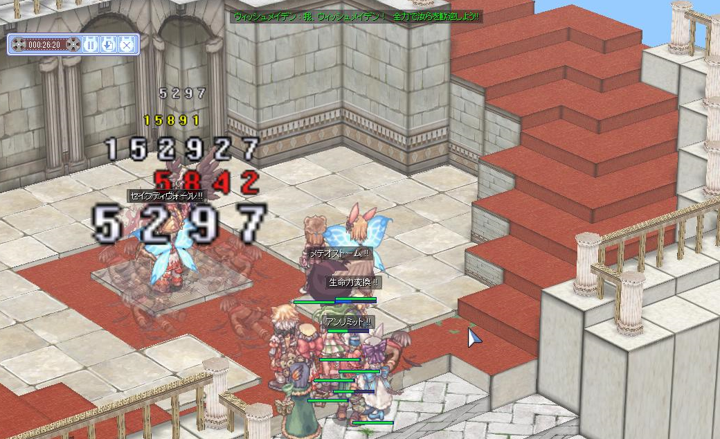ウィッシュメイデンとの戦いのスクリーンショットは上手く撮れませんでした。リプレイから撮れば綺麗に撮れそうですが、そこまでする気力がありません。ウィッシュメイデンはHPは428万程度、念1、天使のボスです。グラフィックはランドグリスの色違いです。ランドグリスとの違いはアースクエイクといった強力なスキル攻撃がなく、取り巻きがいない点です。それでも実装当時の2008年には強力なボスだった筈ですが、3次職が実装されてからかなりの時間が経過した現在では特にクエストの障害になる様な強さとは言えません