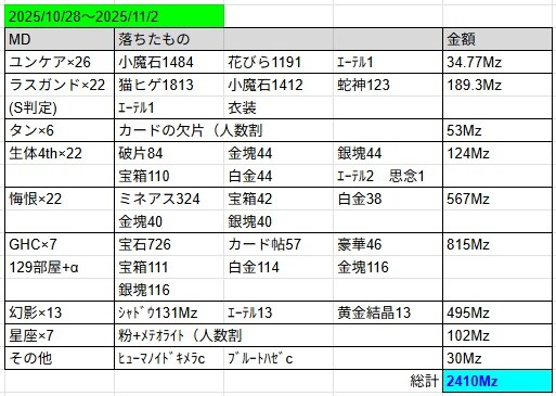 今週も地道にユンケア26周、ラスガンド22周、タン6周、生体4th22周、悔恨22周、GHC4th全部屋7周、幻影13周、星座7周で2.41Gz。来週も頑張りましょう。