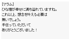 次回以降のひな壇でやってほしい事・新規討伐mob増やすのはいいとして既存mobの討伐数減らすなり調整しろ・グループかえてまた同じ狩場行くのめんどくさ過ぎ・時間沸きボスモンスターの代理で即湧きもどきmobを一時的に導入とか調整・ひな壇の経験値をいい加減200以上でも受け取れるように変更・幸せのひな壇の難易度調整、問題数の削減・コンプリートで+10チケお願いします。