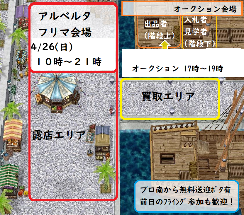 10時になりましたので、アルベルタフリマ開催開始します!今日は17時から船の上でオークションもありますのでお楽しみにです!