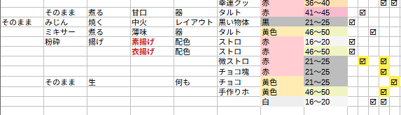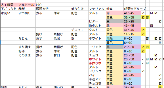 あとチョコレートことマテリアルにも内部ランクがあるので★5を狙う時も注意だゾ(★5が出ないマテリアルがある。★5レシピから下げていくのが無難。マテリアルを動かすと種類のグループも動くので注意)…めんどくさいね!