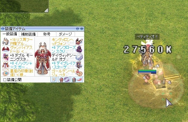+5ウィキッドクロスから+9になったらどれくらい変わるか試したら、説明文(スキルダメ25%UP)と同じで約25%UP!発動系とオラティオ無しでこのダメージなら、あればMダメ見えるんじゃないの?と思ってニブルDで試し切り。(お試し道場に行かないのはケチだから)闇4相手と条件付きではあるけど、初めてペティティオでMダメが出た…!嬉しい!!!!